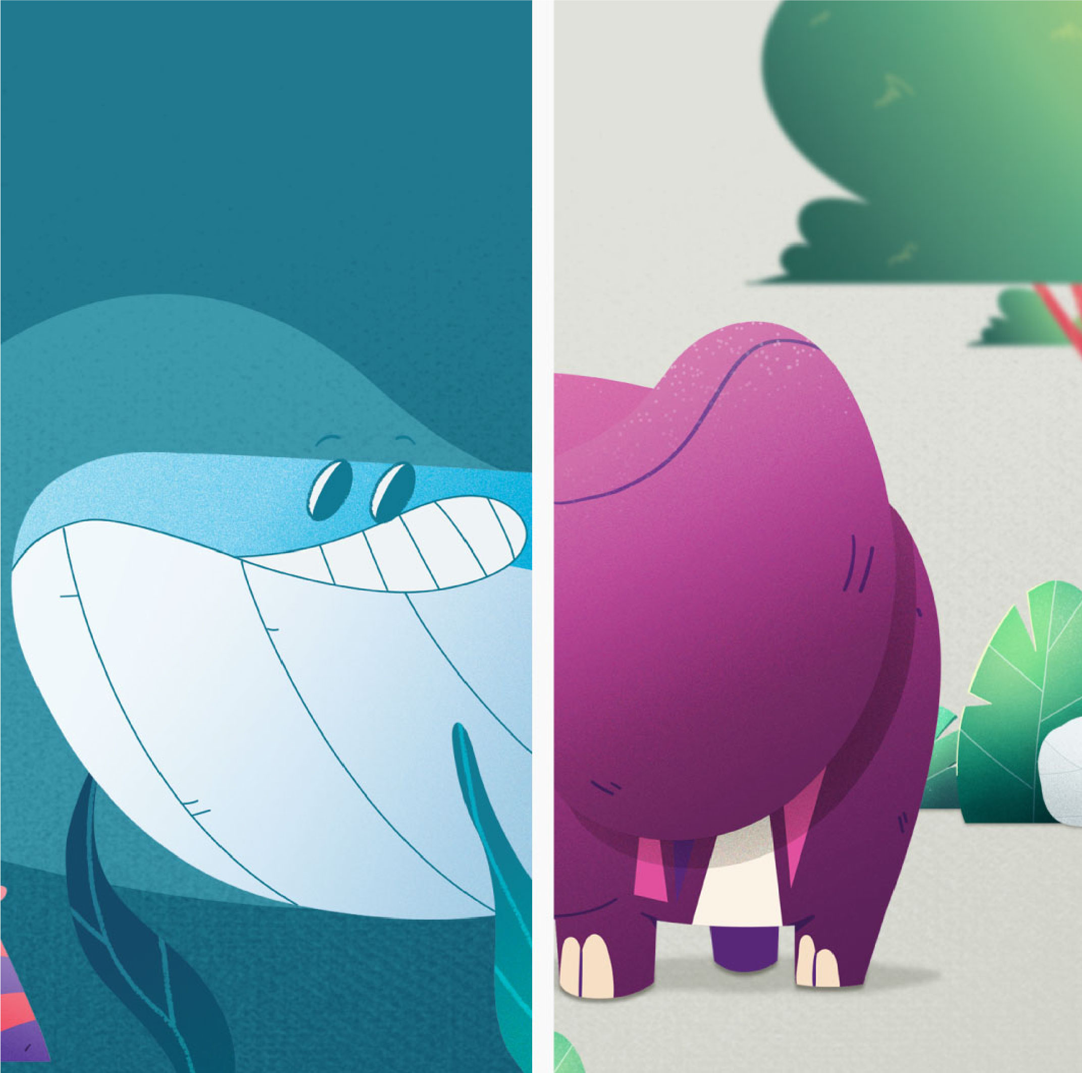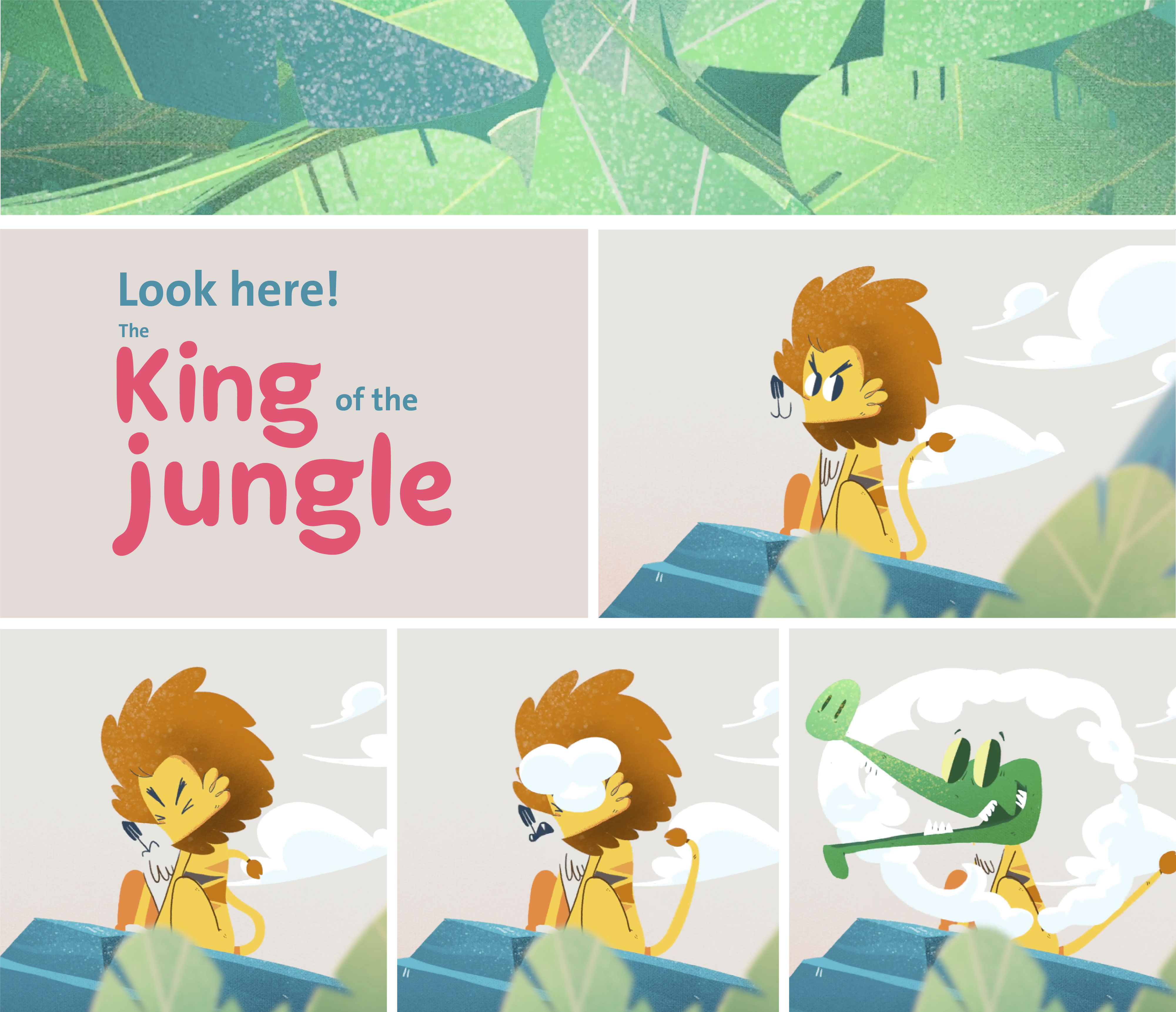 We also created the story-line for a video where these characters dwell mostly in the savanna, with its typical trees, open skies, clouds, vines, and big plant leaves, all elements that we use as props for every other communication channel.
